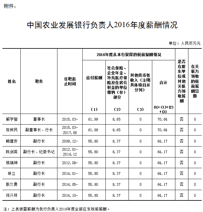 自2015年1月起,中國(guó)農(nóng)業(yè)發(fā)展銀行董事長(zhǎng)、行長(zhǎng)及其他副職負(fù)責(zé)人的薪酬,按照國(guó)家關(guān)于中央管理企業(yè)負(fù)責(zé)人薪酬制度改革的意見(jiàn)執(zhí)行。根據(jù)國(guó)家有關(guān)規(guī)定,現(xiàn)公開(kāi)披露中國(guó)農(nóng)業(yè)發(fā)展銀行負(fù)責(zé)人2016年度薪酬。