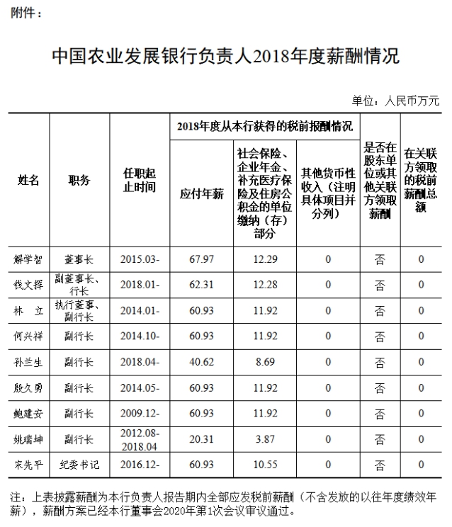 自2015年1月起,中國農(nóng)業(yè)發(fā)展銀行董事長、行長、紀(jì)委書記及其他副職負(fù)責(zé)人的薪酬,按照國家關(guān)于中央管理企業(yè)負(fù)責(zé)人薪酬制度改革的意見執(zhí)行。根據(jù)國家有關(guān)規(guī)定,現(xiàn)公開披露中國農(nóng)業(yè)發(fā)展銀行負(fù)責(zé)人2018年度薪酬。