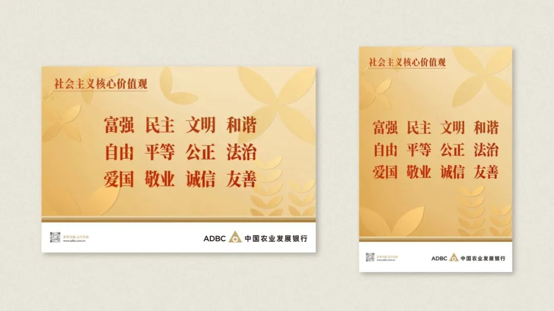 社會主義核心價值觀海報。以農(nóng)發(fā)行品牌識別色“稻香金”為基底,應(yīng)用《中國農(nóng)業(yè)發(fā)展銀行視覺形象識別系統(tǒng)手冊》(簡稱“VI手冊”)中規(guī)范的三種輔助圖形——新苗、飛鳥、繁花,進(jìn)行符號化創(chuàng)意設(shè)計。新苗象征著發(fā)展與希望,飛鳥象征著向上和自由,繁花象征著收獲和繁榮。設(shè)計凸顯農(nóng)發(fā)行宣傳海報專屬性,強(qiáng)化了農(nóng)發(fā)行品牌形象與社會主義核心價值觀的關(guān)聯(lián)度。