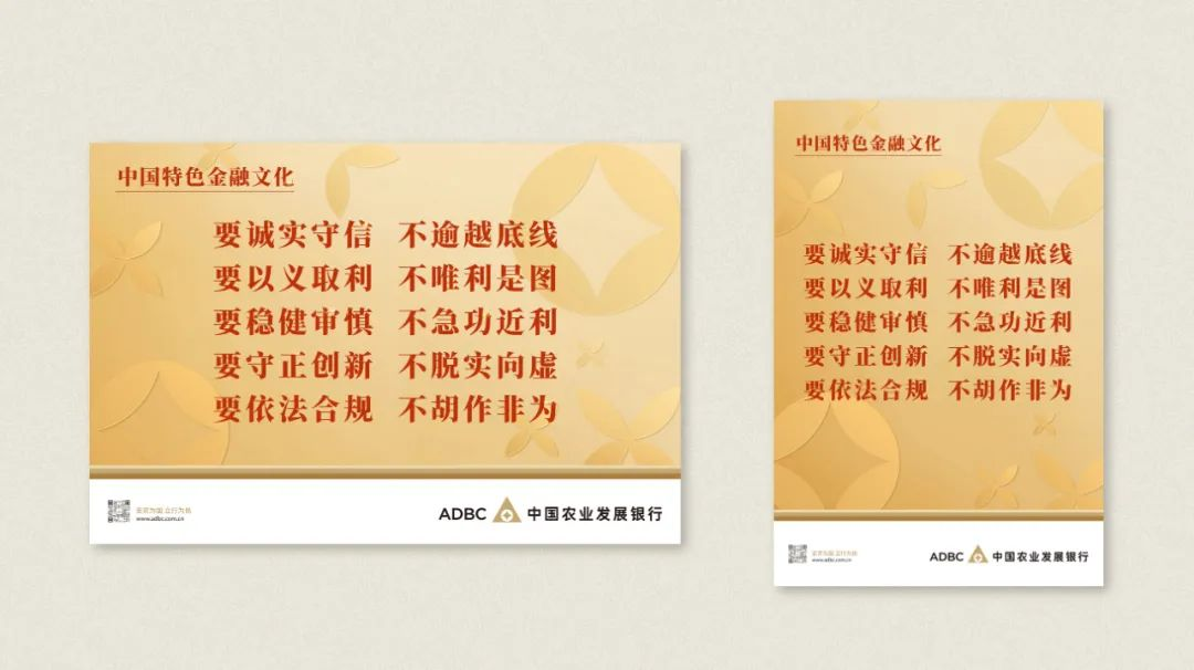 此次發(fā)布的海報是規(guī)范農(nóng)發(fā)行文化理念宣貫的有效手段,是展示現(xiàn)代化農(nóng)業(yè)政策性銀行品牌形象的重要途徑,是實施農(nóng)發(fā)行文化鑄魂工程的關(guān)鍵舉措。海報包括四部分內(nèi)容:社會主義核心價值觀、中國特色金融文化、農(nóng)發(fā)行核心文化理念和農(nóng)發(fā)行4個子文化理念。11款海報,每款包含橫豎2版,共計22張。