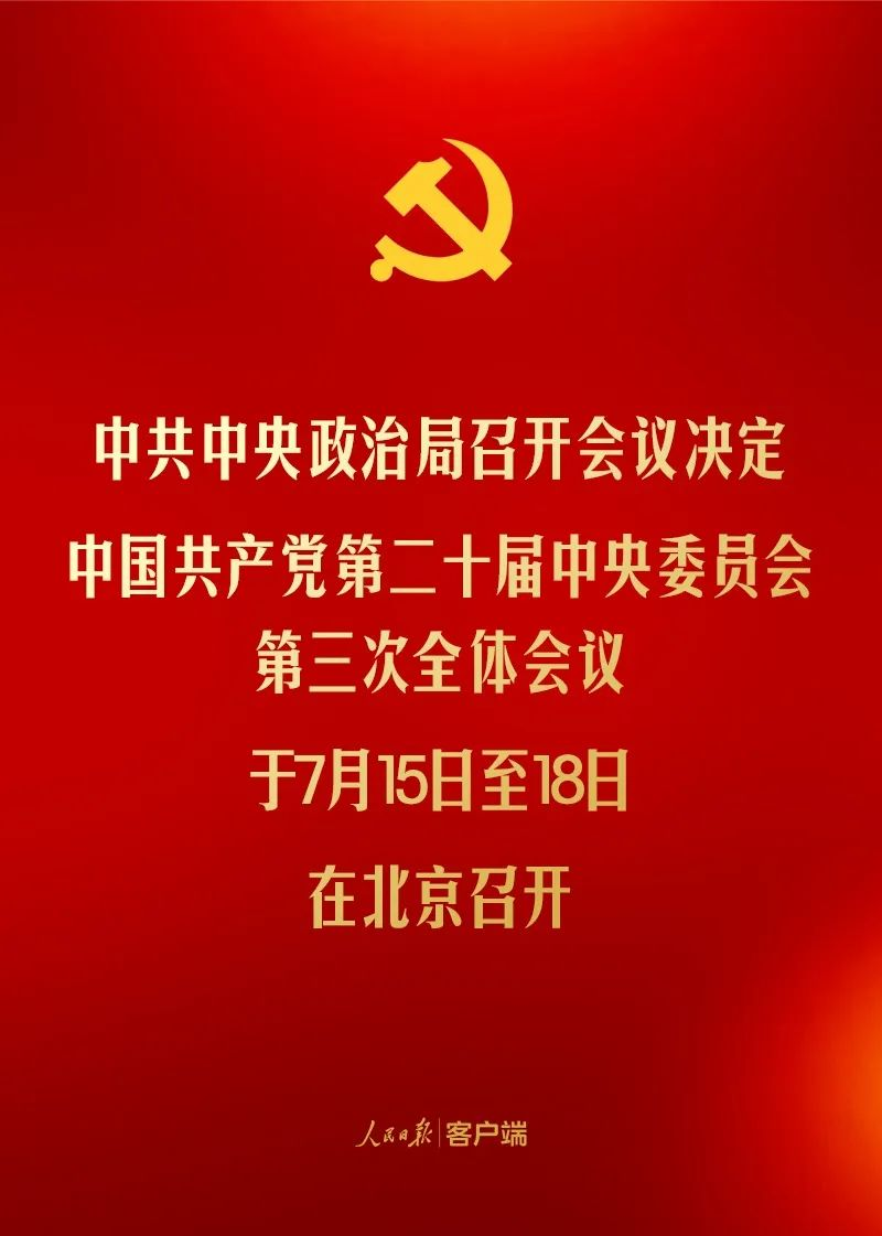 會(huì)議決定,中國(guó)共產(chǎn)黨第二十屆中央委員會(huì)第三次全體會(huì)議于7月15日至18日在北京召開(kāi)。