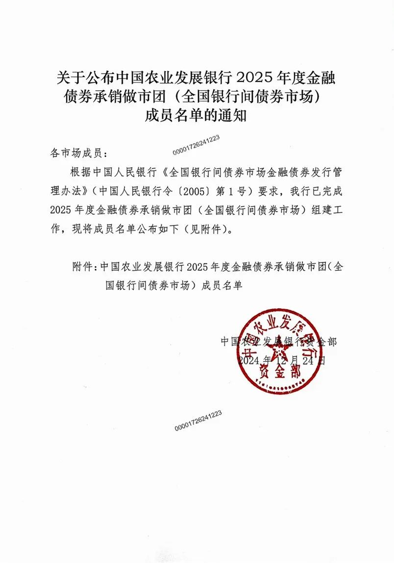12月24日,中國農業(yè)發(fā)展銀行在中國貨幣網、中國債券信息網和上海清算所官方網站等平臺公布2025年度金融債券承銷做市團(全國銀行間債券市場)成員名單,成員共69家。2025年,農發(fā)行將主動對接行內資金需要,適當增加債券發(fā)行規(guī)模,加快年初債券發(fā)行節(jié)奏,有力服務國家戰(zhàn)略和鄉(xiāng)村全面振興。