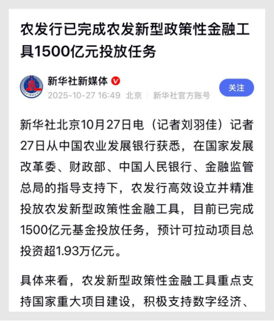 記者從中國農(nóng)業(yè)發(fā)展銀行了解到,在國家發(fā)展改革委、財政部、中國人民銀行、金融監(jiān)管總局的指導(dǎo)支持下,農(nóng)發(fā)行高效設(shè)立并精準投放農(nóng)發(fā)新型政策性金融工具,目前已完成1500億元基金投放任務(wù),預(yù)計可拉動項目總投資超1.93萬億元。(中央電視臺《朝聞天下》2025年10月28日)