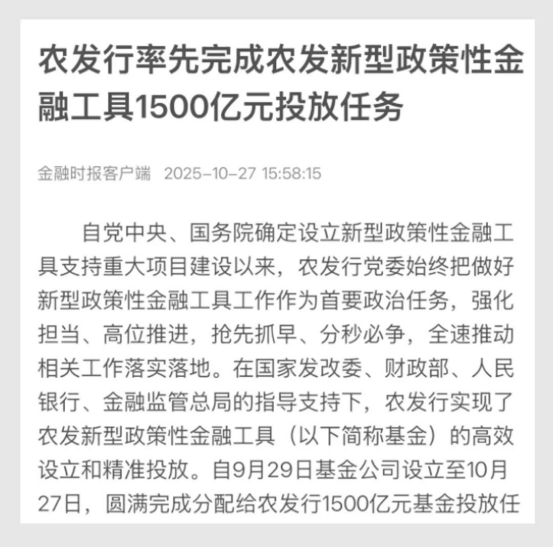 農(nóng)發(fā)行表示,將從“高效投放”轉(zhuǎn)向“精細管理”,做好基金投后管理,加強項目監(jiān)測,合規(guī)使用資金,深化投貸聯(lián)動,以綜合服務(wù)提升政策效能,進一步發(fā)揮政策性金融逆周期調(diào)節(jié)作用,為服務(wù)國家戰(zhàn)略、推動實體經(jīng)濟高質(zhì)量發(fā)展作出更大貢獻。(新華社新媒體2025年10月27日)
