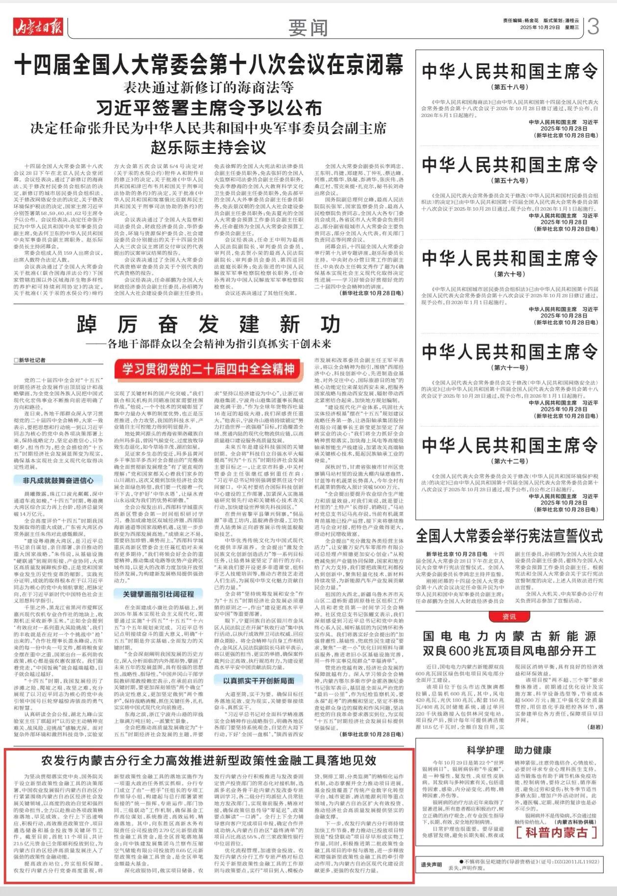 2、內蒙古自治區(qū)分行:內蒙古日報《農發(fā)行內蒙古分行全力高效推進新型政策性金融工具落地見效》