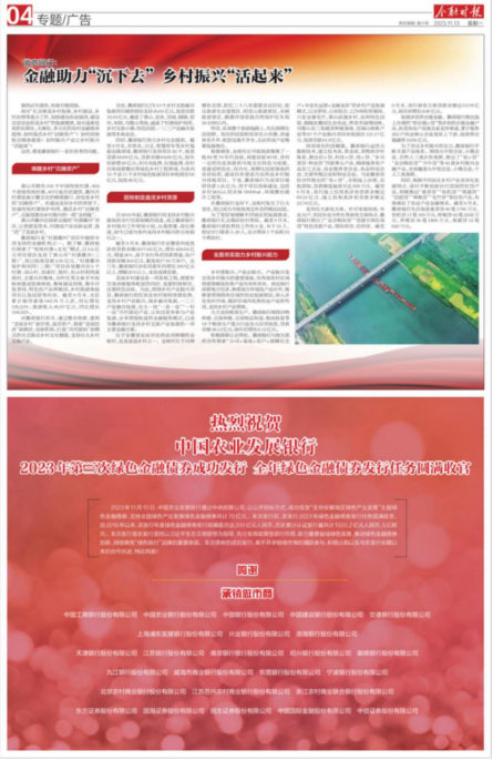 【金融時報】熱烈祝賀 中國農(nóng)業(yè)發(fā)展銀行2023年第三次綠色金融債券成功發(fā)行 全年綠色金融債券發(fā)行任務(wù)圓滿收官