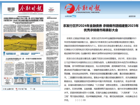 本報(bào)訊 記者趙洋報(bào)道 日前,農(nóng)發(fā)行召開2024年金融債券承銷做市團(tuán)組建暨2023年優(yōu)秀承銷做市商表彰大會,通報(bào)2023年度農(nóng)發(fā)行業(yè)務(wù)經(jīng)營情況和債券發(fā)行情況,表彰農(nóng)發(fā)債優(yōu)秀承銷做市機(jī)構(gòu)與個(gè)人。農(nóng)發(fā)行總行資金部主要負(fù)責(zé)人主持會議,農(nóng)發(fā)行湖南分行行領(lǐng)導(dǎo)和總行相關(guān)業(yè)務(wù)部室負(fù)責(zé)人參加會議。農(nóng)發(fā)債承銷做市團(tuán)成員、基礎(chǔ)設(shè)施機(jī)構(gòu)代表和《金融時(shí)報(bào)》媒體代表等80余家單位代表受邀參加會議。