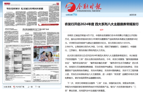 此次發(fā)行是農(nóng)發(fā)行正式開啟2024年度四大系列八大主題債券常規(guī)發(fā)行,充分彰顯了農(nóng)發(fā)債服務“三農(nóng)”的社會責任和特色定位。今年,農(nóng)發(fā)行將聚焦“服務國家糧食安全”“服務農(nóng)業(yè)現(xiàn)代化”“服務城鄉(xiāng)融合發(fā)展”“服務農(nóng)村生態(tài)文明建設”四大系列,持續(xù)發(fā)行支持糧棉油購銷儲、支持農(nóng)地保護和建設、支持農(nóng)業(yè)科技和種業(yè)、支持重要農(nóng)產(chǎn)品和物流體系建設、支持水利建設、支持農(nóng)村路網(wǎng)建設、支持千萬工程改善人居、支持生態(tài)環(huán)保和林業(yè)八大主題債券,進一步提升“農(nóng)發(fā)債”品牌的市場關注度和影響力,更好體現(xiàn)政策性金融履職成效。