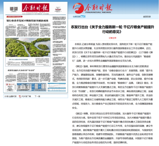 本報(bào)訊 記者左希報(bào)道 為深入貫徹落實(shí)黨中央、國(guó)務(wù)院關(guān)于新一輪千億斤糧食產(chǎn)能提升行動(dòng)的決策部署,扎實(shí)有效落實(shí)農(nóng)發(fā)行服務(wù)國(guó)家糧食安全工作會(huì)議精神,近日,農(nóng)發(fā)行印發(fā)《關(guān)于全力服務(wù)新一輪千億斤糧食產(chǎn)能提升行動(dòng)的意見(jiàn)》(以下簡(jiǎn)稱《意見(jiàn)》),明確五項(xiàng)專項(xiàng)支持政策和九大重點(diǎn)支持方向,推動(dòng)全行鞏固提升“糧食銀行”品牌,進(jìn)一步加大政策性金融服務(wù)國(guó)家糧食安全支持力度。