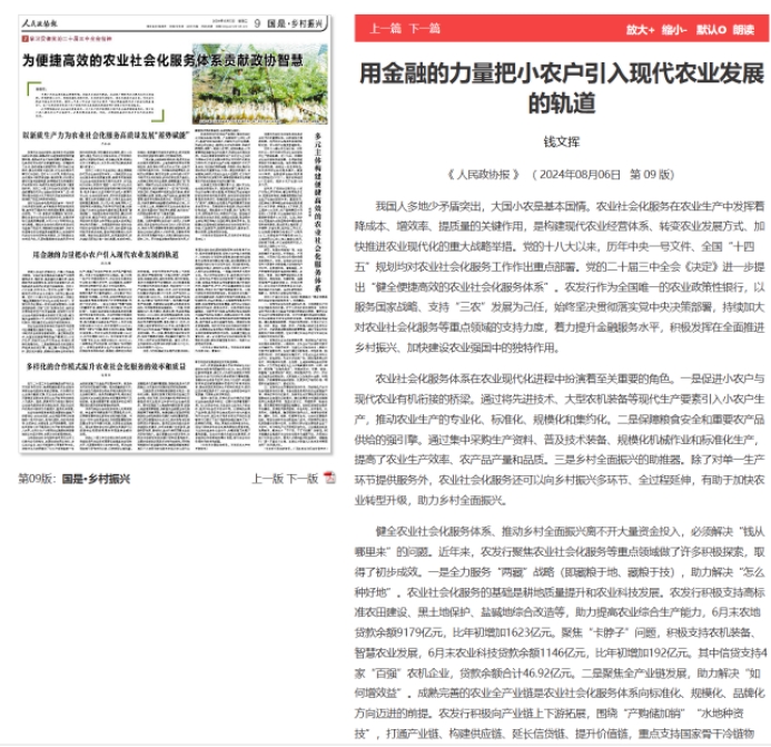健全農(nóng)業(yè)社會化服務體系、推動鄉(xiāng)村全面振興離不開大量資金投入,必須解決“錢從哪里來”的問題。近年來,農(nóng)發(fā)行聚焦農(nóng)業(yè)社會化服務等重點領(lǐng)域做了許多積極探索,取得了初步成效。一是全力服務“兩藏”戰(zhàn)略(即藏糧于地、藏糧于技),助力解決“怎么種好地”。農(nóng)業(yè)社會化服務的基礎(chǔ)是耕地質(zhì)量提升和農(nóng)業(yè)科技發(fā)展。農(nóng)發(fā)行積極支持高標準農(nóng)田建設、黑土地保護、鹽堿地綜合改造等,助力提高農(nóng)業(yè)綜合生產(chǎn)能力,6月末農(nóng)地貸款余額9179億元,比年初增加1623億元。聚焦“卡脖子”問題,積極支持農(nóng)機裝備、智慧農(nóng)業(yè)發(fā)展,6月末農(nóng)業(yè)科技貸款余額1146億元,比年初增加192億元。其中信貸支持4家“百強”農(nóng)機企業(yè),貸款余額合計46.92億元。二是聚焦全產(chǎn)業(yè)鏈發(fā)展,助力解決“如何增效益”。成熟完善的農(nóng)業(yè)全產(chǎn)業(yè)鏈是農(nóng)業(yè)社會化服務體系向標準化、規(guī)?;?、品牌化方向邁進的前提。農(nóng)發(fā)行積極向產(chǎn)業(yè)鏈上下游拓展,圍繞“產(chǎn)購儲加銷”“水地種資技”,打通產(chǎn)業(yè)鏈、構(gòu)建供應鏈、延長信貸鏈、提升價值鏈,重點支持國家骨干冷鏈物流、農(nóng)村流通重要節(jié)點等現(xiàn)代流通體系建設,推動農(nóng)村一二三產(chǎn)業(yè)融合發(fā)展。截至6月末,全行農(nóng)村流通體系建設貸款余額2357億元,農(nóng)產(chǎn)品加工業(yè)貸款余額562億元。三是創(chuàng)新金融產(chǎn)品服務,助力解決“誰來種好地”。堅持模式創(chuàng)新和產(chǎn)品創(chuàng)新,為新型農(nóng)業(yè)經(jīng)營主體提供更加適應、可得性更強的金融服務。一方面,堅持融智先行、科技賦能、數(shù)據(jù)支撐,集成運用生物識別、OCR識別、區(qū)塊鏈等金融科技,實現(xiàn)信貸資源精準匹配,投產(chǎn)上線北大荒等高標準農(nóng)田托管種植場景,累放貸款22.7億元,支持黑土地托管面積達139萬畝,有效解決農(nóng)民專業(yè)合作社在生產(chǎn)種植環(huán)節(jié)融資難、融資貴的問題。另一方面,聚焦提升聯(lián)動帶農(nóng)質(zhì)效,持續(xù)開展模式創(chuàng)新,用金融的力量把小農(nóng)戶引入現(xiàn)代農(nóng)業(yè)發(fā)展的軌道。截至6月末,全行新型農(nóng)業(yè)經(jīng)營主體貸款余額3877億元,比年初增加714億元。