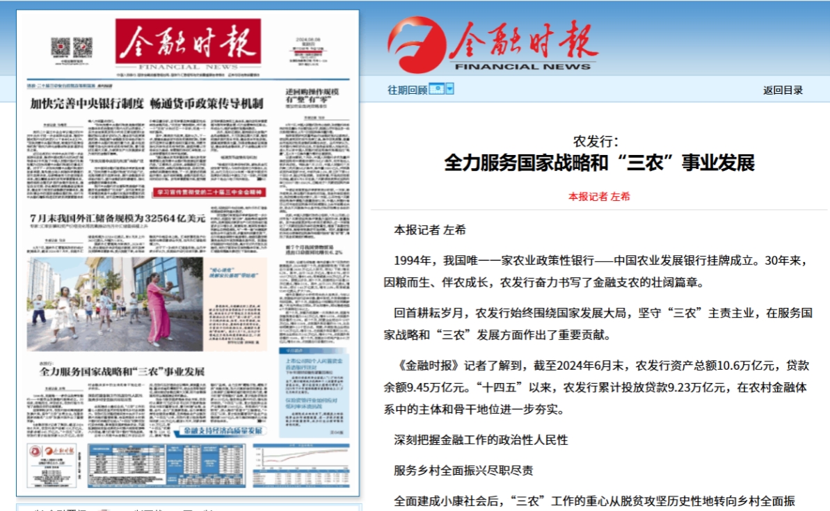 《金融時(shí)報(bào)》記者了解到,截至2024年6月末,農(nóng)發(fā)行資產(chǎn)總額10.6萬億元,貸款余額9.45萬億元?!笆奈濉币詠恚r(nóng)發(fā)行累計(jì)投放貸款9.23萬億元,在農(nóng)村金融體系中的主體和骨干地位進(jìn)一步夯實(shí)。