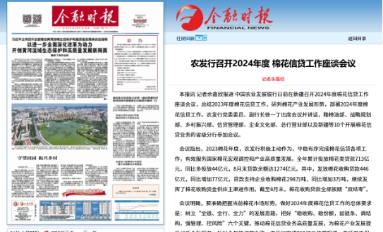 會(huì)議強(qiáng)調(diào),2024年是新中國成立75周年,也是農(nóng)發(fā)行成立30周年和棉花信貸業(yè)務(wù)發(fā)展的第30年,做好本年度棉花信貸工作責(zé)任重大、任務(wù)艱巨。各級(jí)行要以高度的政治責(zé)任感,展現(xiàn)新?lián)?dāng)、實(shí)現(xiàn)新作為,高質(zhì)量完成2024年度棉花信貸各項(xiàng)工作,譜寫農(nóng)發(fā)行金融支農(nóng)新篇章。