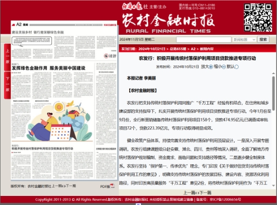 健全政策產品體系,持續(xù)完善支持傳統村落保護利用頂層設計。一是深入開展專題調研。農發(fā)行組建課題組分赴安徽、湖北、四川、貴州等地深入調研,全面了解地方傳統村落保護規(guī)劃編制、資金需求、面臨問題和支持路徑等情況。二是逐步健全制度體系。農發(fā)行堅持“保護第一、傳承優(yōu)先”理念,專門印發(fā)《關于做好信貸支持傳統村落保護利用工作的意見》,明確支持傳統村落保護的發(fā)展目標、建設內容、資源活化利用路徑,同時印發(fā)高質量服務“千萬工程”意見2份,將傳統村落保護利用作為“千萬工程”鄉(xiāng)村精神文明建設的重點領域加大支持,創(chuàng)新探索以公共屬性導向開發(fā)模式為主的支持路徑,逐步健全支持傳統村落保護利用的制度體系。三是專門設立傳統村落保護貸款專項產品。農發(fā)行聚焦傳統村落保護修繕、人居環(huán)境整治、資源活化利用等傳統村落保護重要元素,專門設置專項貸款產品,在貸款規(guī)模、利率、期限等方面給予適當傾斜。截至今年9月末,全行累計審批傳統村落保護項目貸款561.05億元,累計投放貸款314.42億元,貸款余額282.30億元,充分發(fā)揮政策性金融支持中華農耕文明保護傳承的示范引領作用。