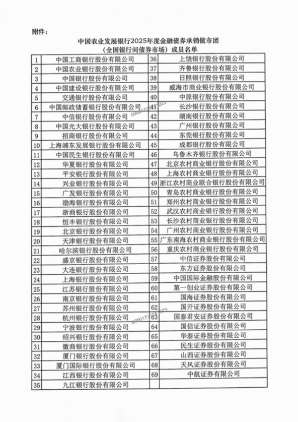 中國農(nóng)業(yè)發(fā)展銀行25日公布2025年度金融債券承銷做市團(tuán)(全國銀行間債券市場)成員名單,成員共69家。截至2024年末,農(nóng)發(fā)行累計(jì)發(fā)債籌資逾18萬億元,年末存量債券規(guī)模超過8萬億元。
