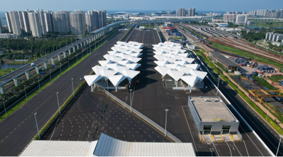 這是2025年9月23日拍攝的??谛潞8酆湍细邸岸€口岸”(貨運(yùn))集中查驗(yàn)場海關(guān)查驗(yàn)區(qū)(無人機(jī)照片)。新華社記者 楊冠宇 攝