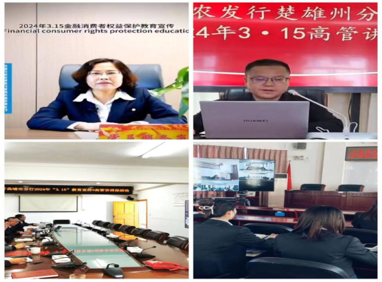 結(jié)合活動要求和工作實(shí)際,各級行圍繞主題,開展“金融高管講消?!被顒印G甘蟹中型ㄟ^視頻宣講方式,面向全行干部職工講解客戶投訴的概念、處理流程等內(nèi)容;玉溪市分行帶頭在全轄2024年“3·15”金融消費(fèi)者權(quán)益保護(hù)教育宣傳活動暨金融消費(fèi)者保護(hù)服務(wù)平臺上線工作部署視頻會議上做了《提升站位 加強(qiáng)消費(fèi)者權(quán)益保護(hù)工作》的消保宣講;楚雄州分行結(jié)合農(nóng)發(fā)行工作實(shí)際從3個方面分析講解如何做好金融消保工作;潘家灣支行以《用心守護(hù)金融消費(fèi)者權(quán)益》為主題,用通熟易懂的語言向大眾宣講金融消費(fèi)者享有的八項(xiàng)基本權(quán)利。通過高管帶頭抓消保、講消保,將消保嵌入經(jīng)營管理全流程,形成從業(yè)人員人人參與、人人盡責(zé)的金融消保教育宣傳氛圍。