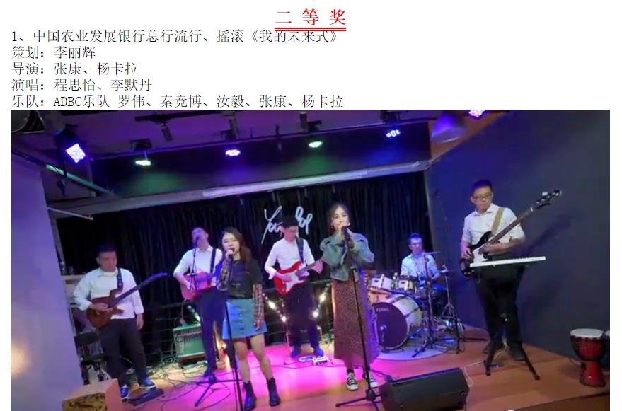 總行機(jī)關(guān)“ADBC”樂隊(duì)此次報(bào)送的翻唱作品《我的未來(lái)式》,通過電聲樂隊(duì)演繹流行搖滾,節(jié)奏歡快活潑、旋律滿載青春氣息、歌詞充滿自信陽(yáng)光,給人以生機(jī)蓬勃、積極向上的青春朝氣,用簡(jiǎn)單直率、熱情洋溢的方式表達(dá)對(duì)夢(mèng)想的執(zhí)著追求、對(duì)未來(lái)的美好向往,勾勒出農(nóng)發(fā)行青年勤勞工作、真誠(chéng)友善、開拓創(chuàng)新的青春風(fēng)采,在全國(guó)金融系統(tǒng)展示了農(nóng)發(fā)行干部職工的藝術(shù)才華和團(tuán)隊(duì)合力。