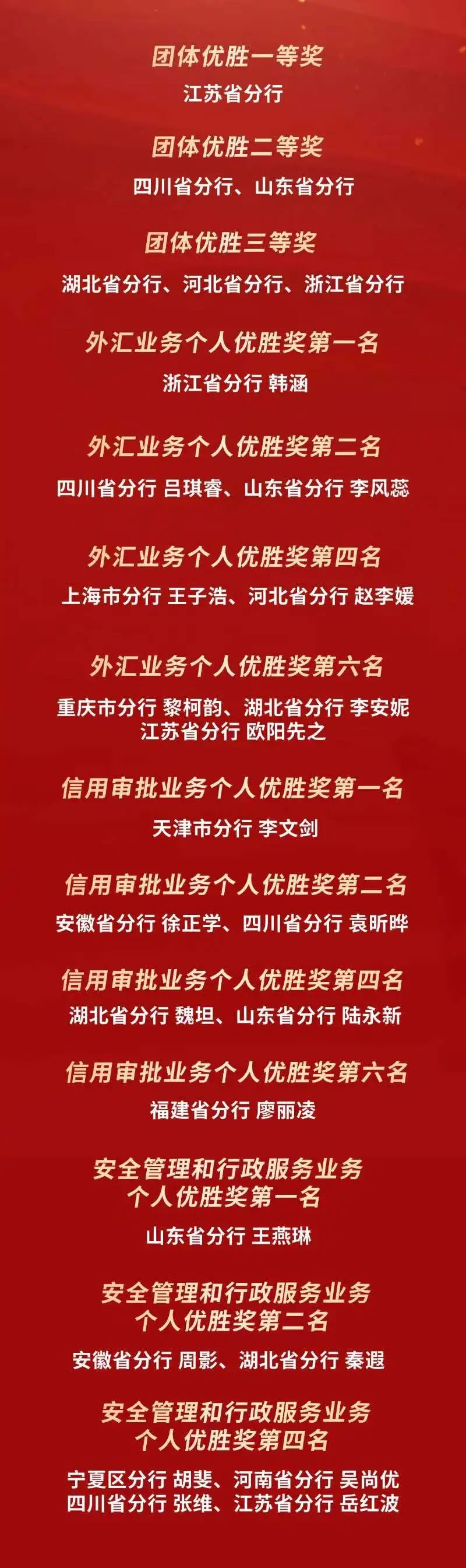 奮斗如筆,繪就精彩篇章;初心如炬,點燃拼搏熱情。參加此次競賽的團隊和選手是全行外匯業(yè)務、信用審批業(yè)務、安全管理和行政服務條線的業(yè)務能手,是農(nóng)發(fā)行廣大職工銳意進取、創(chuàng)先爭優(yōu)的縮影,是農(nóng)發(fā)行勞模精神、勞動精神、工匠精神的生動體現(xiàn)。希望廣大職工以先進典型為榜樣,在各自崗位上踔厲奮發(fā)、砥礪前行,積極投身金融強國和農(nóng)業(yè)強國建設??傂泄⒁源舜胃傎悶槠鯔C,持續(xù)擦亮“金農(nóng)發(fā)行杯”勞動競賽品牌,使勞動競賽成為提升職工專業(yè)素質(zhì)的課堂、激發(fā)職工勞動潛能的舞臺、促進職工成長成才的平臺,不斷為農(nóng)發(fā)行高質(zhì)量發(fā)展和現(xiàn)代化建設注入新的活力。