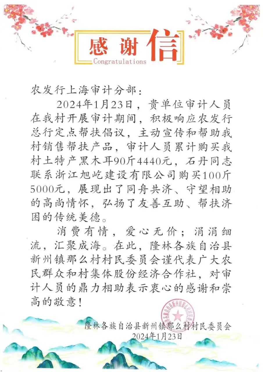 1月23日,上海審計分部在廣西隆林縣開展扶貧捐贈資金使用情況專項審計期間,實地走訪那么村幫扶支持項目。那么村是廣西區(qū)分行定點幫扶村,主要產(chǎn)業(yè)為黑木耳種植。審計人員積極響應總行定點幫扶倡議,熱心采購,共購買黑木耳90斤,金額合計4440元,以實際行動支持扶貧工作。同時,浙江審計辦石丹同志積極聯(lián)系家鄉(xiāng)企業(yè)——浙江旭屹建設有限公司購買黑木耳100斤,金額合計5000元。那么村村民委員會特發(fā)來感謝信,村民也自發(fā)制作刺繡表示感謝。