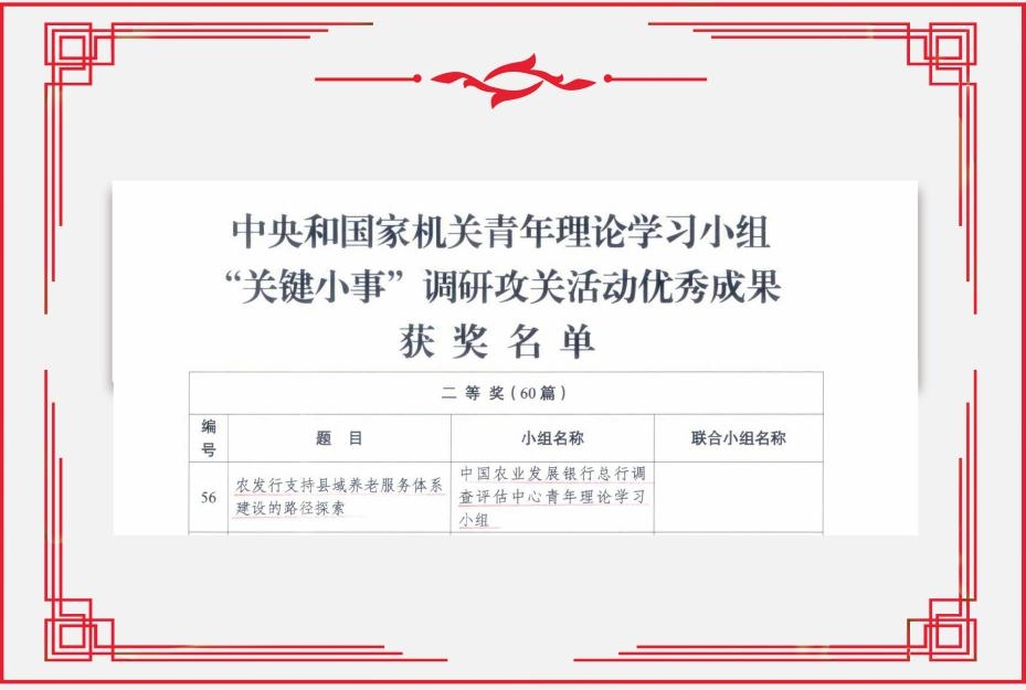 總行調(diào)查評(píng)估中心青年理論學(xué)習(xí)小組連續(xù)兩年榮獲中央和國(guó)家機(jī)關(guān)“關(guān)鍵小事”調(diào)研攻關(guān)二等獎(jiǎng)。開(kāi)展“關(guān)鍵小事”調(diào)研就是用專業(yè)性解決黨中央關(guān)注、人民群眾關(guān)切的民生問(wèn)題。調(diào)評(píng)中心黨支部對(duì)調(diào)研活動(dòng)高度重視,精心組織、認(rèn)真選題,報(bào)送的調(diào)研成果從4448個(gè)課題中脫穎而出,這源于中心支部始終用政治性、人民性、專業(yè)性引領(lǐng)青年隊(duì)伍,加大青年培養(yǎng),初步形成了自成體系、特點(diǎn)突出的支部青年工作法,有力推進(jìn)了年輕干部隊(duì)伍建設(shè)走深走實(shí)。