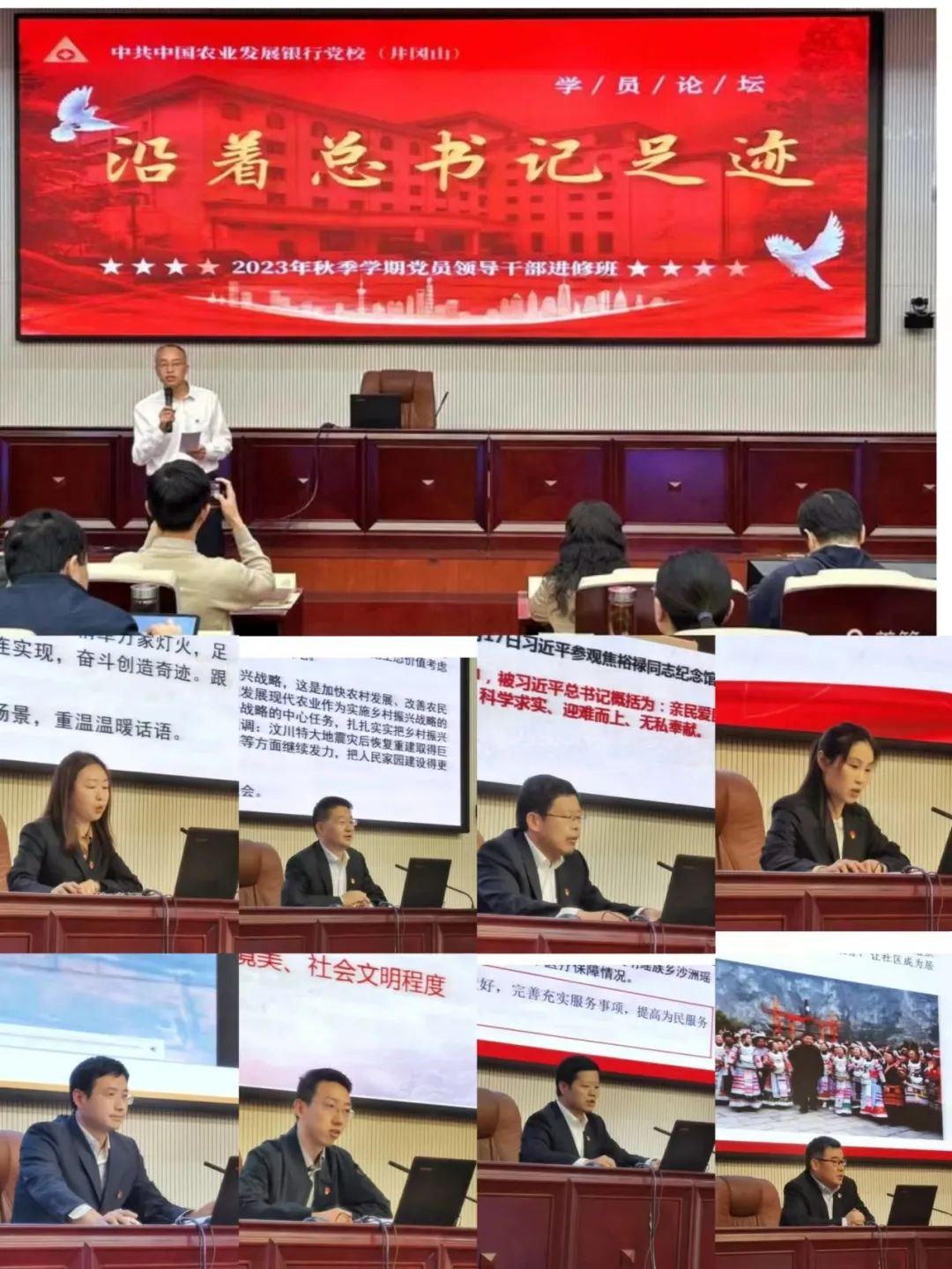 為進一步深化習(xí)近平新時代中國特色社會主義思想和黨的二十大精神的學(xué)習(xí)成果,中國農(nóng)業(yè)發(fā)展銀行井岡山黨校2023年秋季學(xué)期黨員領(lǐng)導(dǎo)干部培訓(xùn)班舉辦3期學(xué)員論壇,全體學(xué)員緊緊圍繞“沿著總書記的足跡”、“堅守共產(chǎn)黨人初心使命,堅持支農(nóng)為國,立行為民”、“樹立正確的權(quán)力觀、政績觀、事業(yè)觀”三大主題,積極開展研討交流。